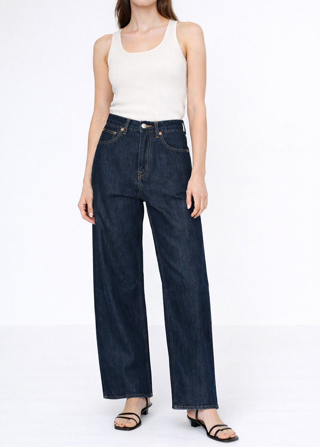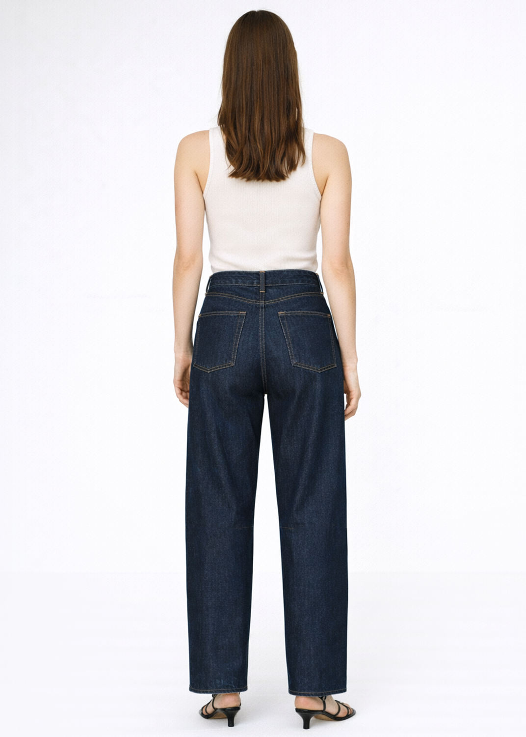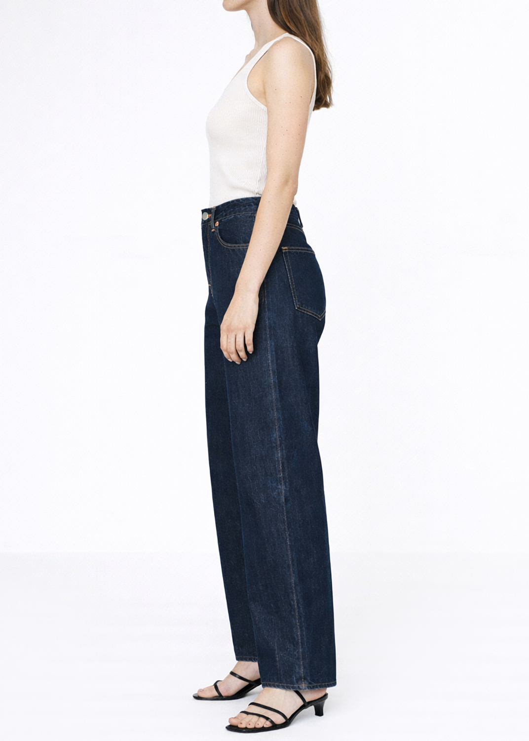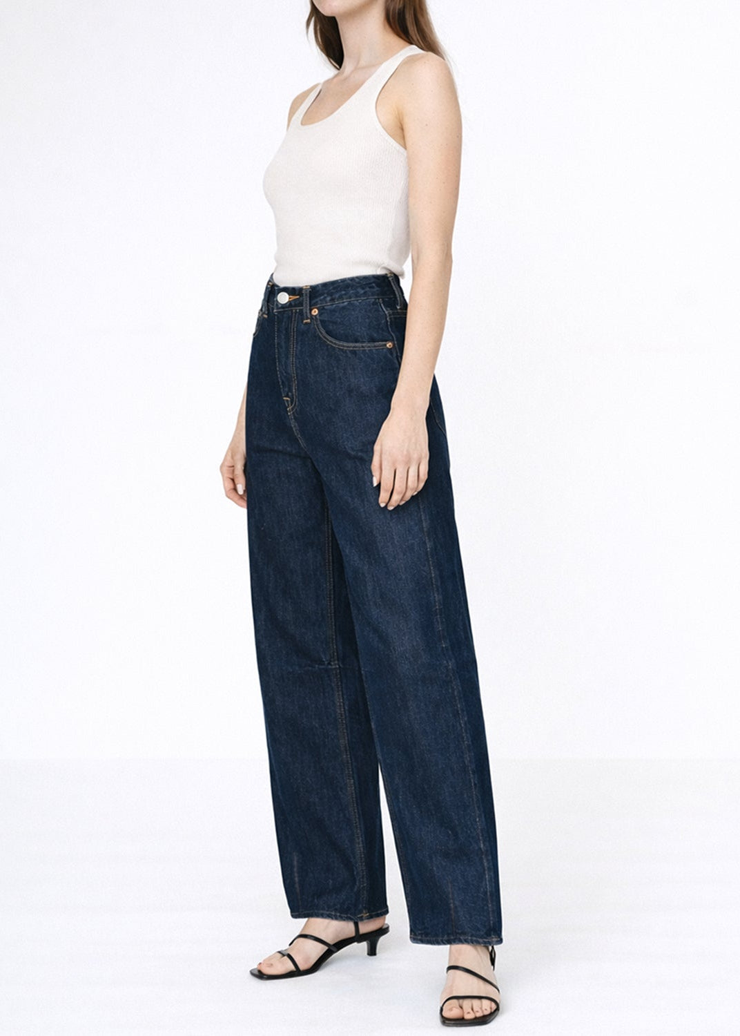 This jean features a relaxed curve fit with wide legs and a loose fit around the hips. The full-length design is long enough to drape over the instep, with darts at the hem that create a slight taper, allowing for elegant folds over the feet. The inner knee darts add a subtle inward curve, giving the jeans a flattering line. Made with a clean, super dark wash, these jeans offer a sophisticated and stylish look.